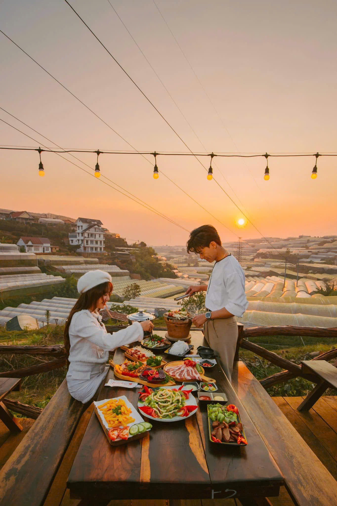 Khi đêm xuống, hàng ngàn nhà lồng đồng loạt lên đèn tạo nên "biển sao" lung linh giữa thung lũng. Nướng BBQ, nhấm nhi đồ uống, ngắm view triệu đô — đêm Đà Lạt chưa bao giờ đẹp đến thế.